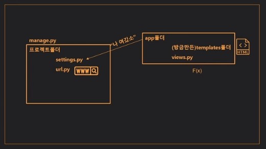 - Django는 파일 및 폴더간의 티키타카로 이루어진다.
