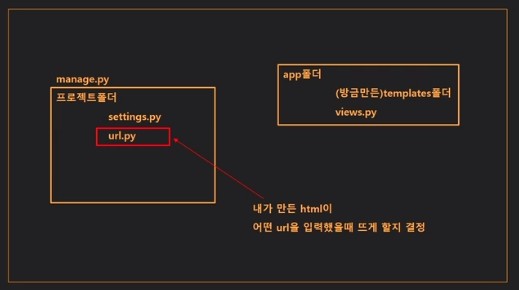 - url.py는 내가 작성한 html이 어떤 URL을 입력했을 때 보여지게 할지 결정해준다.
