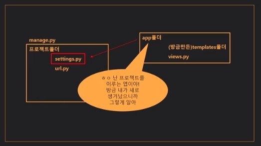 - project폴더의 setting.py에 생성된 app를 사용할 것을 알려준다.