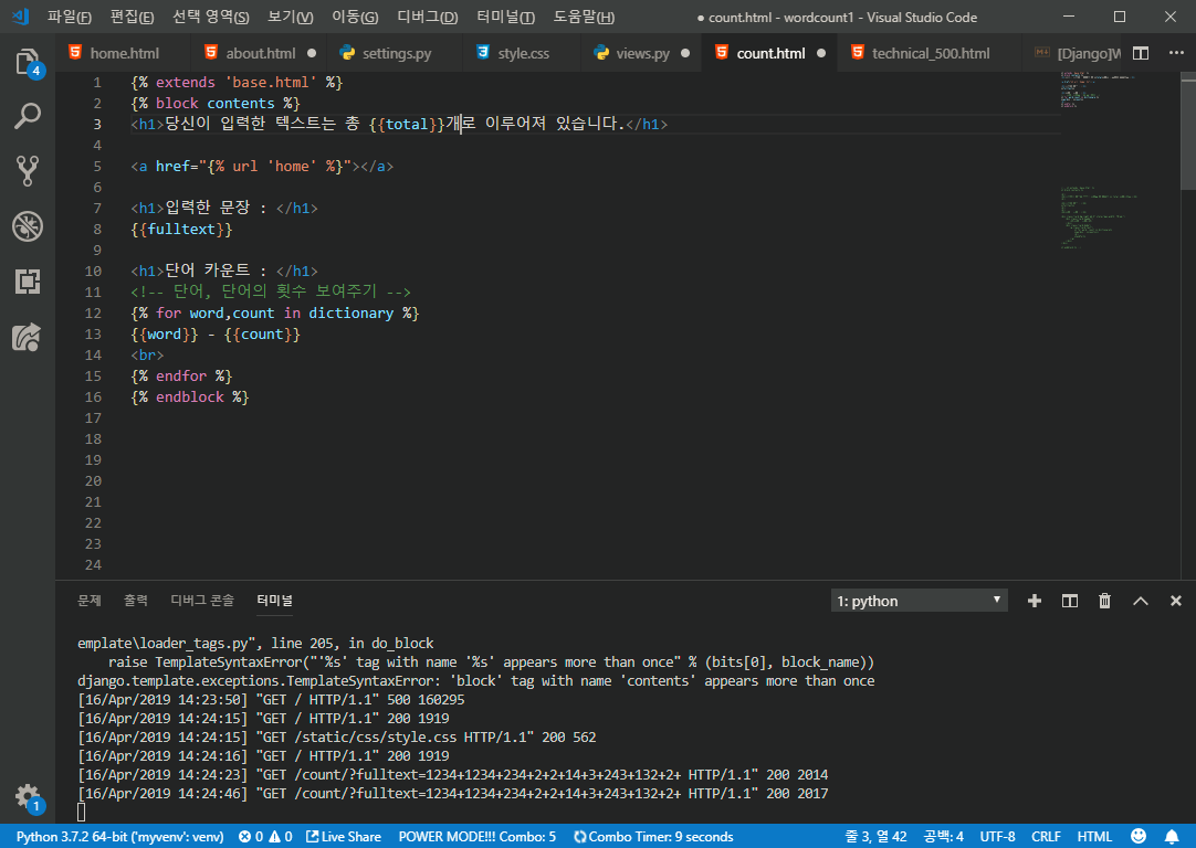 마지막으로 count에 view에서 받아온 데이터를 출력하는 코드를 작성해주면 된다.