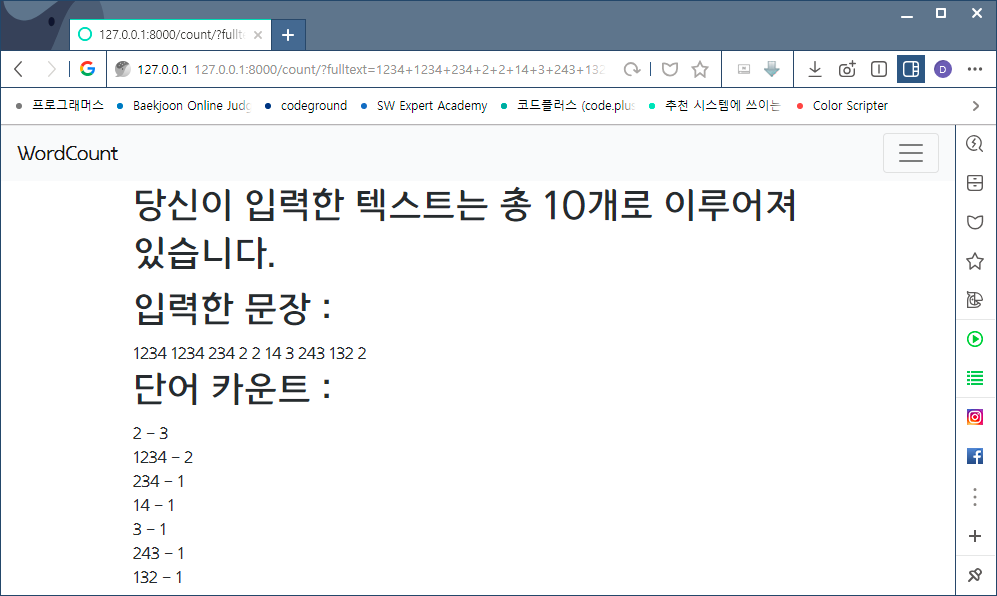 home에서 문장을 입력한 후 버튼을 클릭하게 되면 다음과 같이 단어의 총 갯수와 해당 단어가 작성된 빈도수를 보여주게된다.