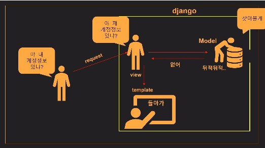 - 사용자가 view에게 데이터를 요청하면 view는 model에게 데이터가 존재하는지 찾게 하여 존재한다면 template를 통해 사용자에게 보여주게한다.